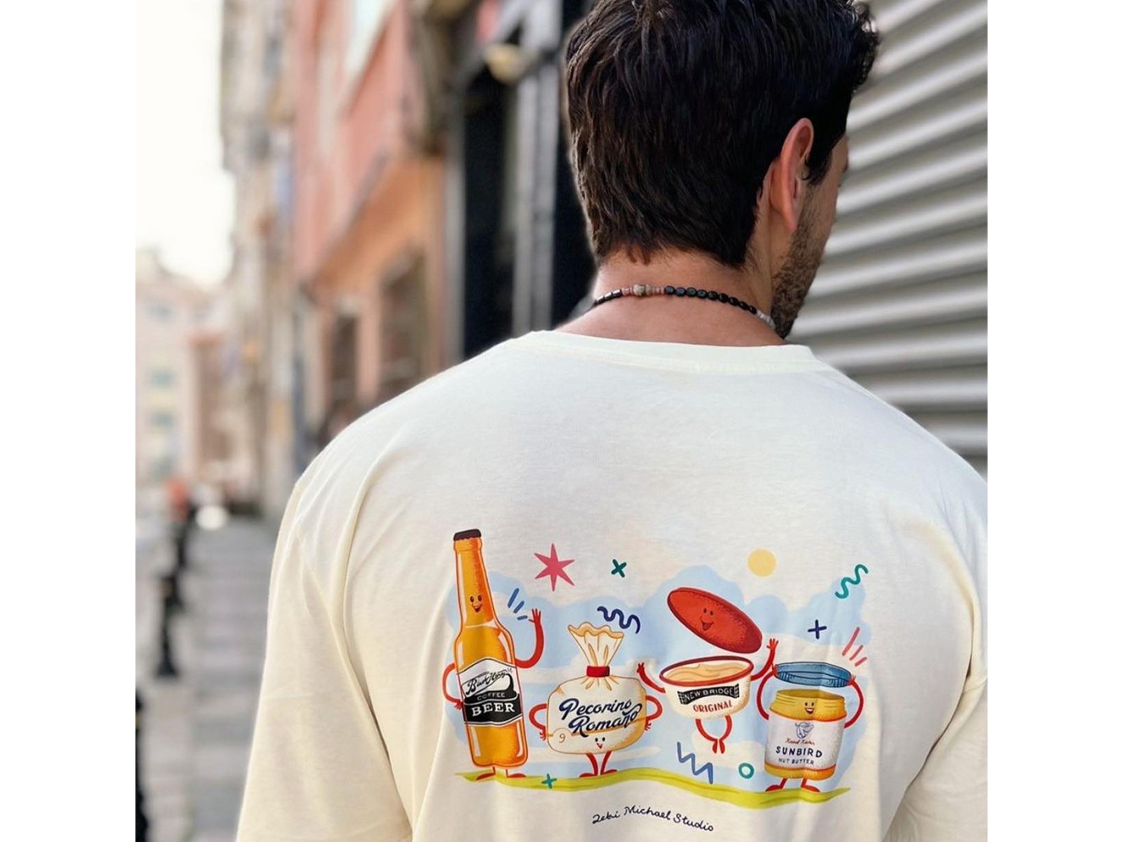 A t-shirt design for Zeki Michael Studio, featuring illustrated brands the studio has worked with